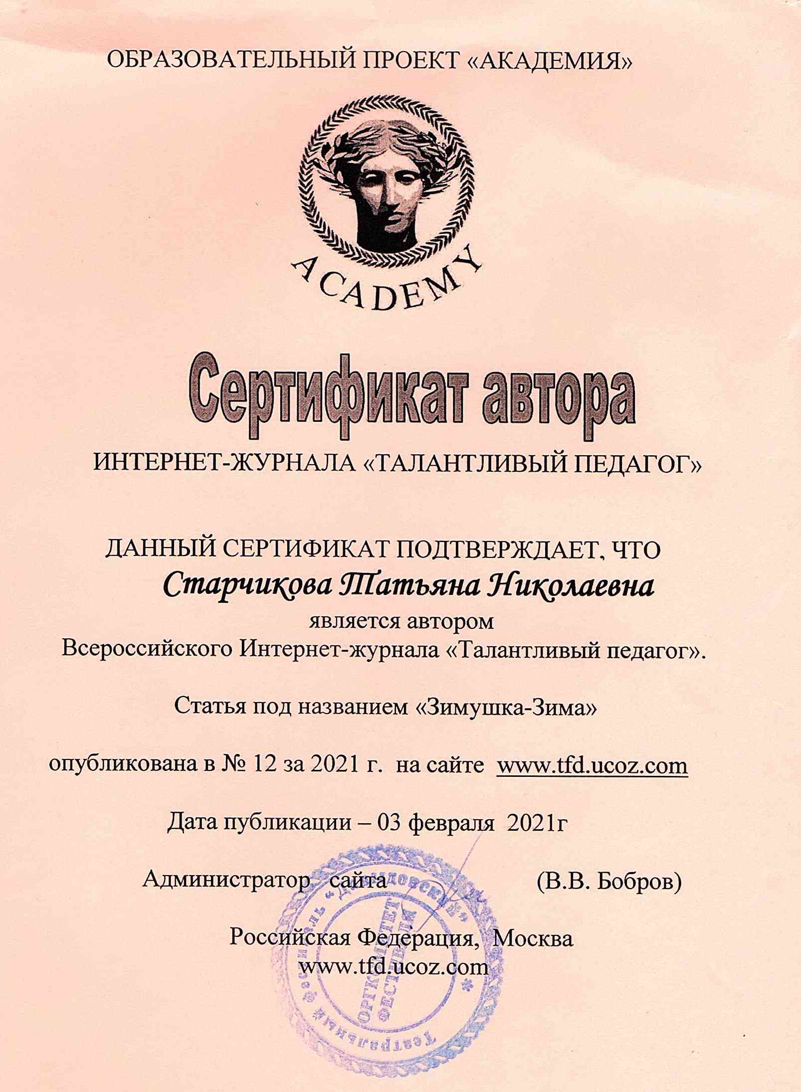 Персональная страничка воспитателя Старчиковой Татьяны Николаевны