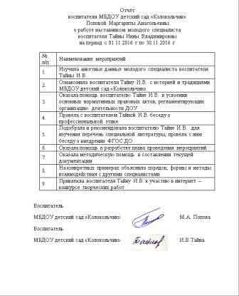 Работа наставником молодого специалиста воспитателя Тайны Инны Владимировны Приказ о наставничестве (png) План работы с молодым специалистом (pdf) Отчёт о работе наставником молодого специалиста Тайны И.В.(png)